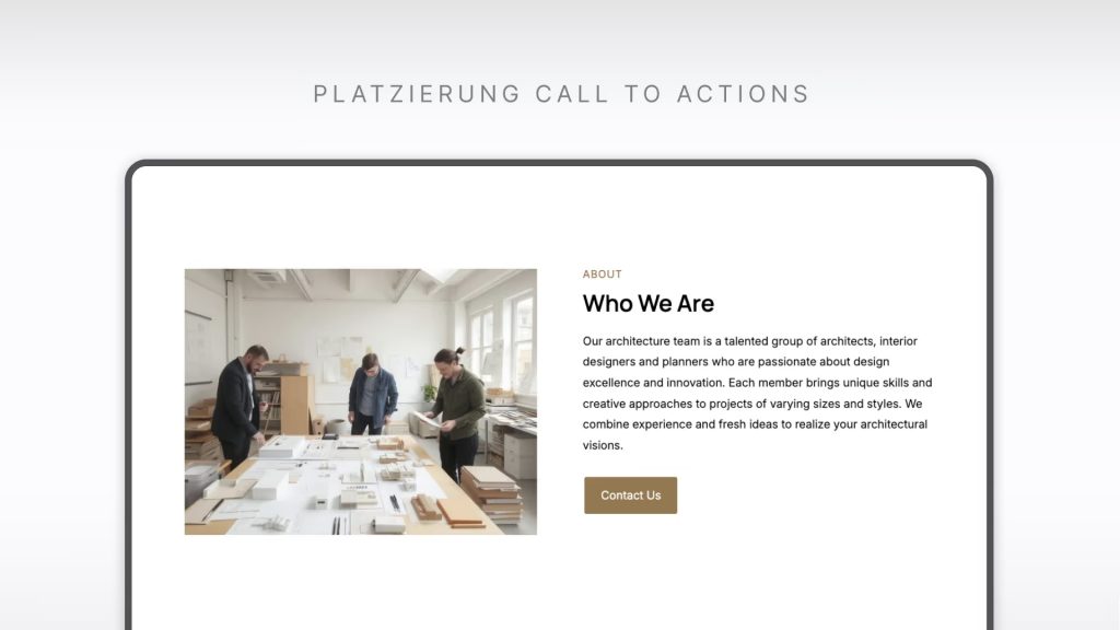 - Positionierung: Platziere den Call to Action an strategischen Punkten auf deiner Seite – zum Beispiel direkt nach einer überzeugenden Headline oder am Ende eines Abschnitts, der den Nutzen deines Angebots verdeutlicht. So wird der CTA dort angezeigt, wo der Nutzer bereits das Interesse an deiner Dienstleistung oder deinem Produkt hat.