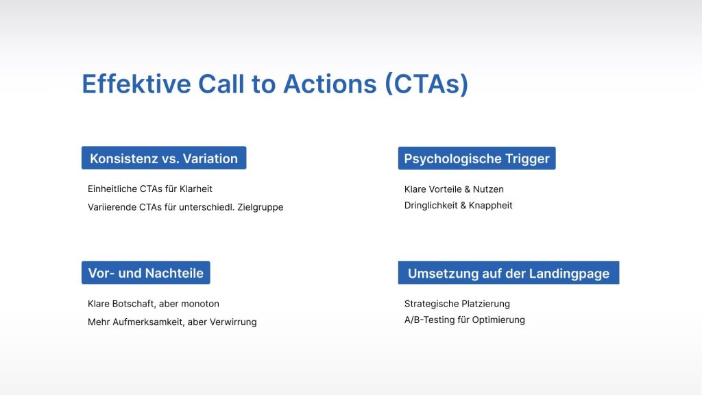 Zentrale Punkte für effektive CTAs: Konsistenz vs. Variation, psychologische Trigger, strategische Platzierung sowie A/B-Testing zur Optimierung