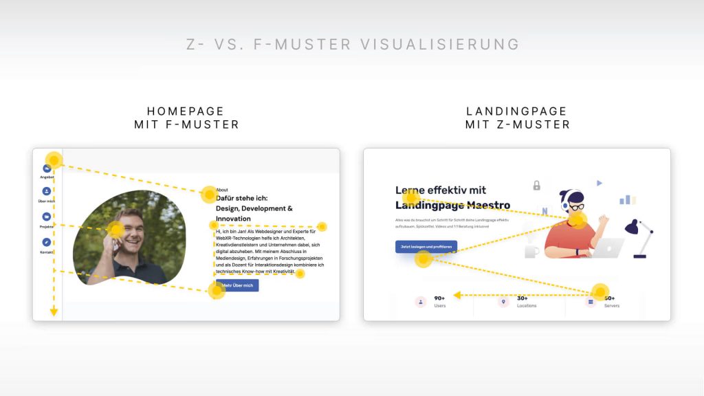 Sobald ein Besucher auf deiner Landingpage ankommt, beginnt er, die Inhalte zu „scannen“. Das menschliche Auge folgt dabei bestimmten Mustern und zwar in der Regel dem F-Muster oder Z-Muster. Diese Verhaltensweisen zu verstehen und für die Benutzerführung zu nutzen, hilft uns die Landingpage effektiv aufzubauen.