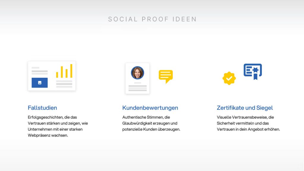 Social Proof – also soziale Beweise wie Bewertungen, Fallstudien oder Empfehlungen – spielt eine Schlüsselrolle dabei, potenzielle Kunden von deiner Kompetenz und Glaubwürdigkeit zu überzeugen und den Landingpage Aufbau noch effektiver zu gestalten.