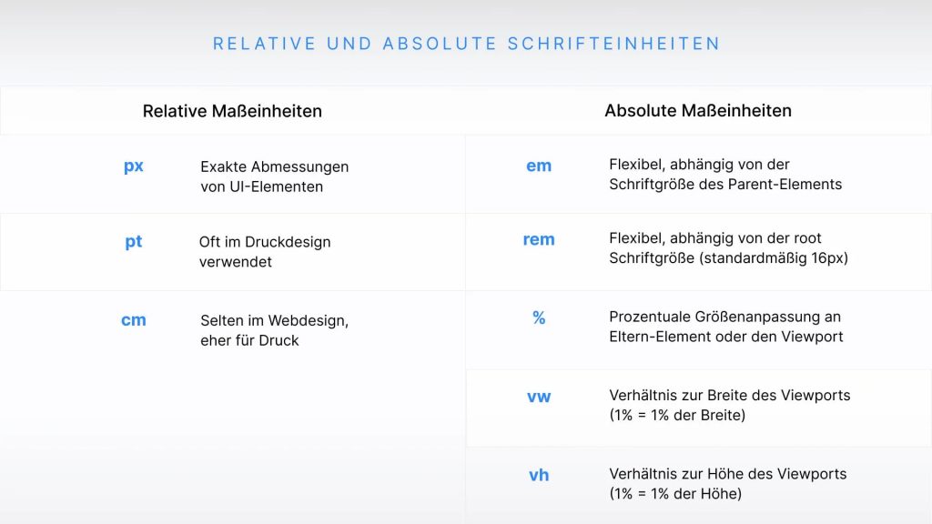 Übersicht von relativen und absoluten Maßeinheiten um Website Typografie einzustellen