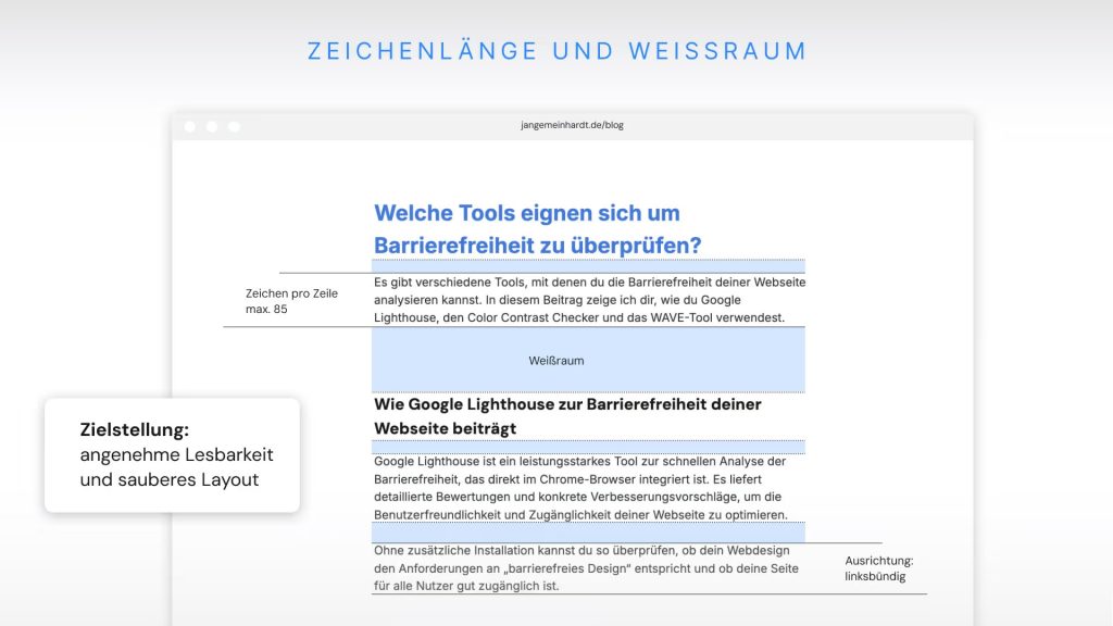 Visualisierung von empfohlener Zeichenlänge, Ausrichtung von Text und Weißraum